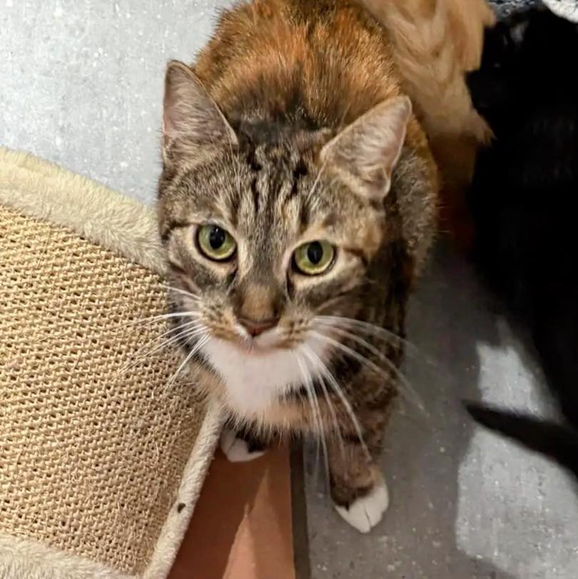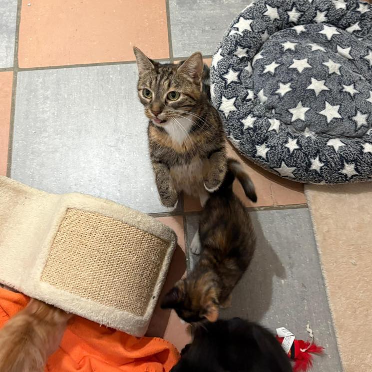 Aktuell lebt sie in einer Pflegestelle mit anderen Katzen. Sie zeigt sich dabei nicht besonders interessiert, reagiert aber auch nicht negativ auf ihre Artgenossen.